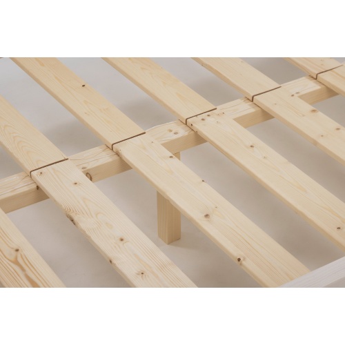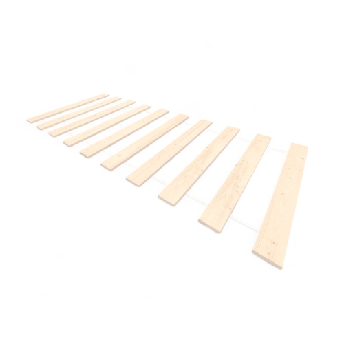 The thickness of one table is 1.8 cm and the width is 9.5 cm. The boards at the base of the bed are connected with two cords for even spreading. The end boards have pre-drilled holes to attach the bed base to the bed frame with screws. The boards are unfinished, natural.